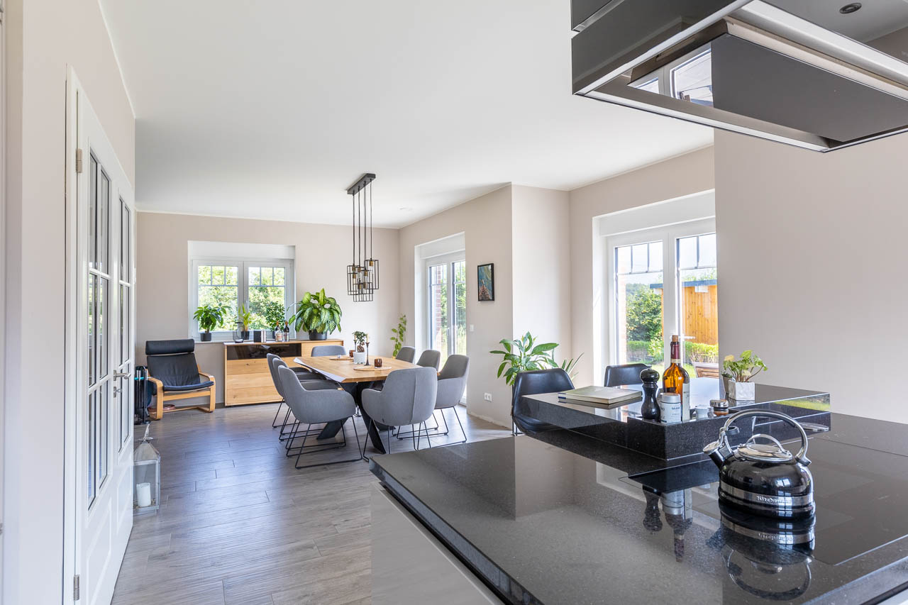 Auch bei der Wahl des Haustyps war diese entscheidend. „Eigentlich war ein Friesenhaus mit grünen Fenstern geplant, aber das Kapitänshaus unserer Kundenberaterin Corinna Steltzer hatte uns dann noch besser gefallen.“ Der breite Kapitänsgiebel, zur Terrassenseite und nicht an der Vorderseite, schafft oben und unten einen architektonisch schönen Erker im Wohnbereich. „Wir haben keine Kinder, aber die Gästezimmer für Freunde und einen großer Koch-Wohn-Essbereich für mehr Gemeinsamkeit im Zusammenleben und um Gäste zu empfangen, war uns sehr wichtig!“